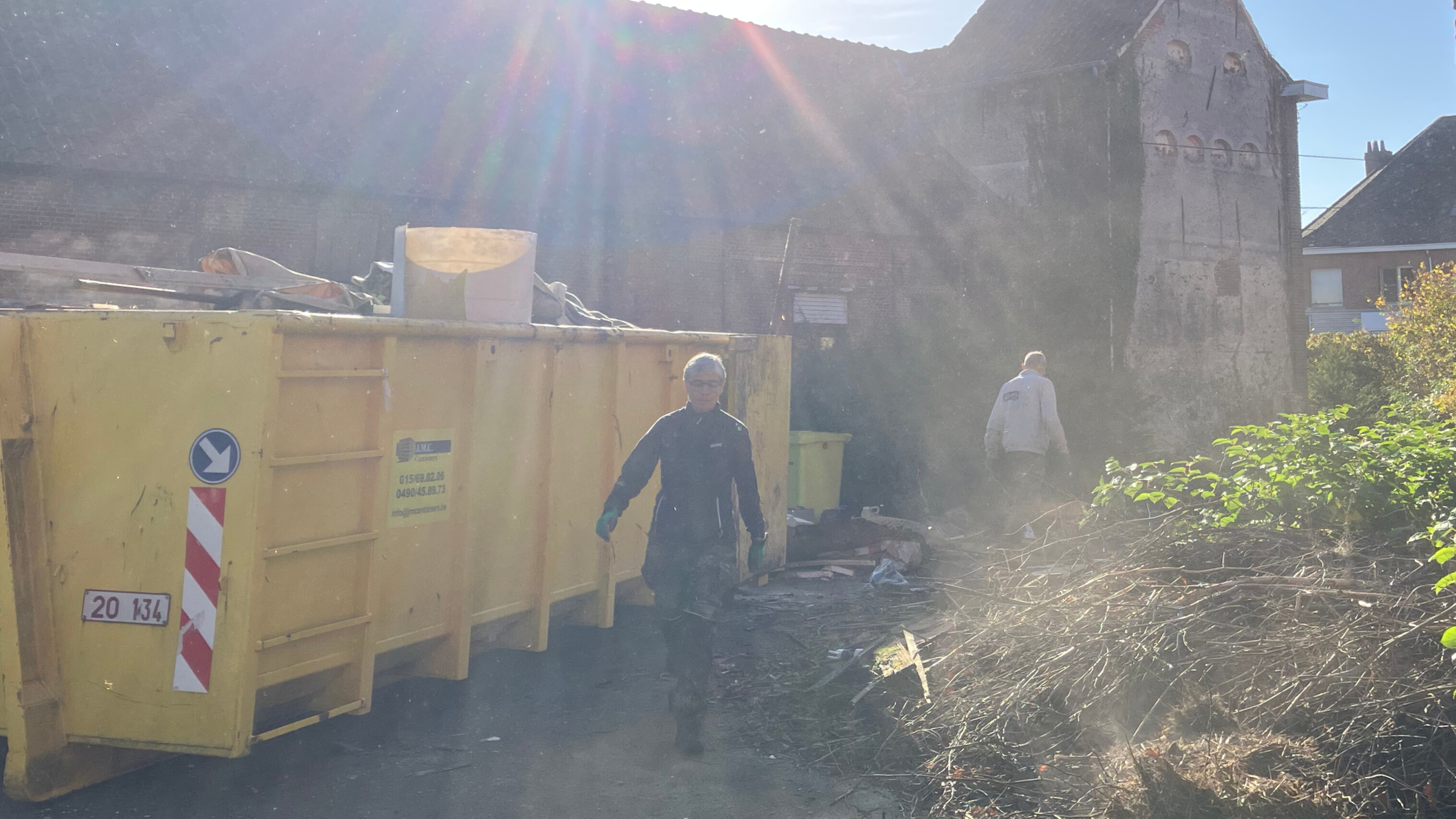 Voor de tweede keer vullen we met een hele groep Landgenoten een gele container met oud isolatiemateriaal, houten wanden, overgebleven spullen, ... Buiten gaat een team de Japanse Duizendkoop te lijf.